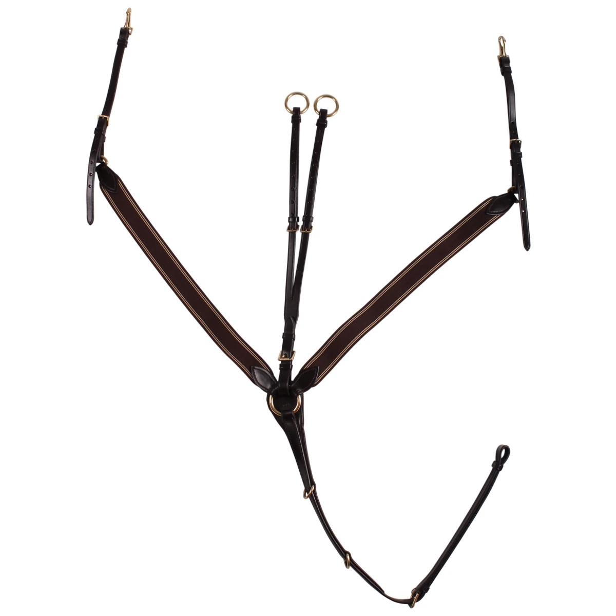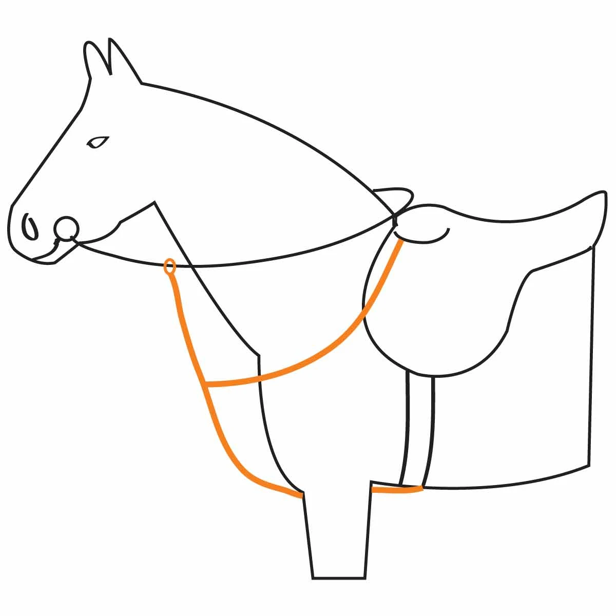 - het borsttuig wordt door middel van clipsluitingen aan de bovenste ringetjes van het zadel, en met een lus om de singel heen bevestigd