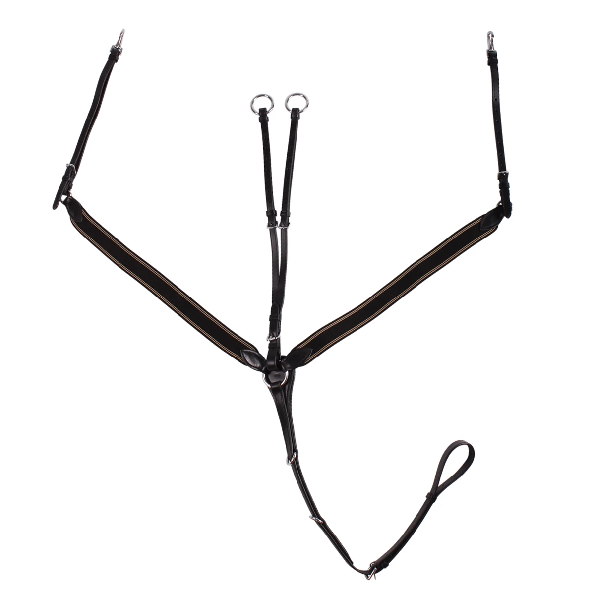 - met afneembare en verstelbare martingaal, welke voorkomt dat het paard zijn hoofd te ver omhoog kan brengen waardoor het contact verloren gaat