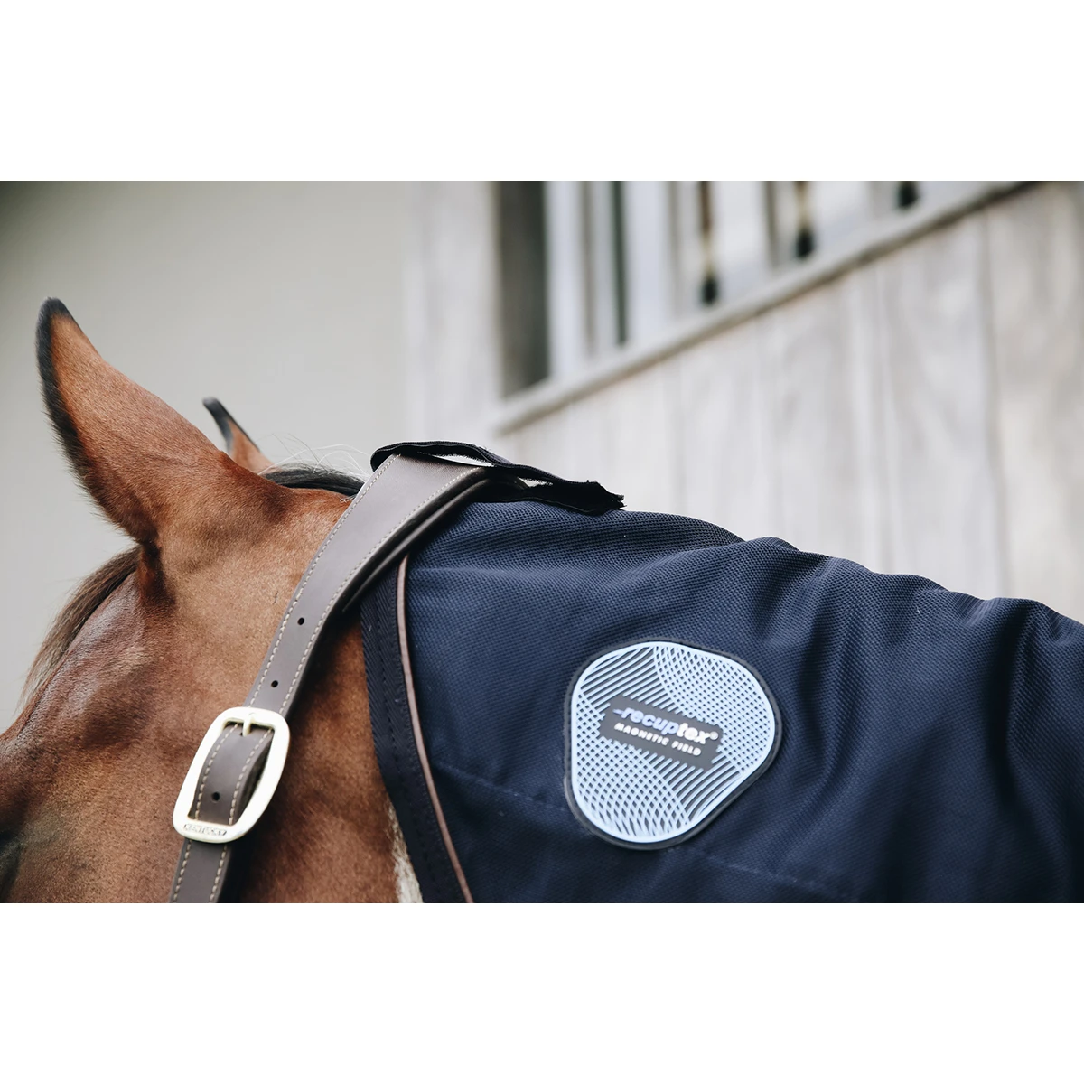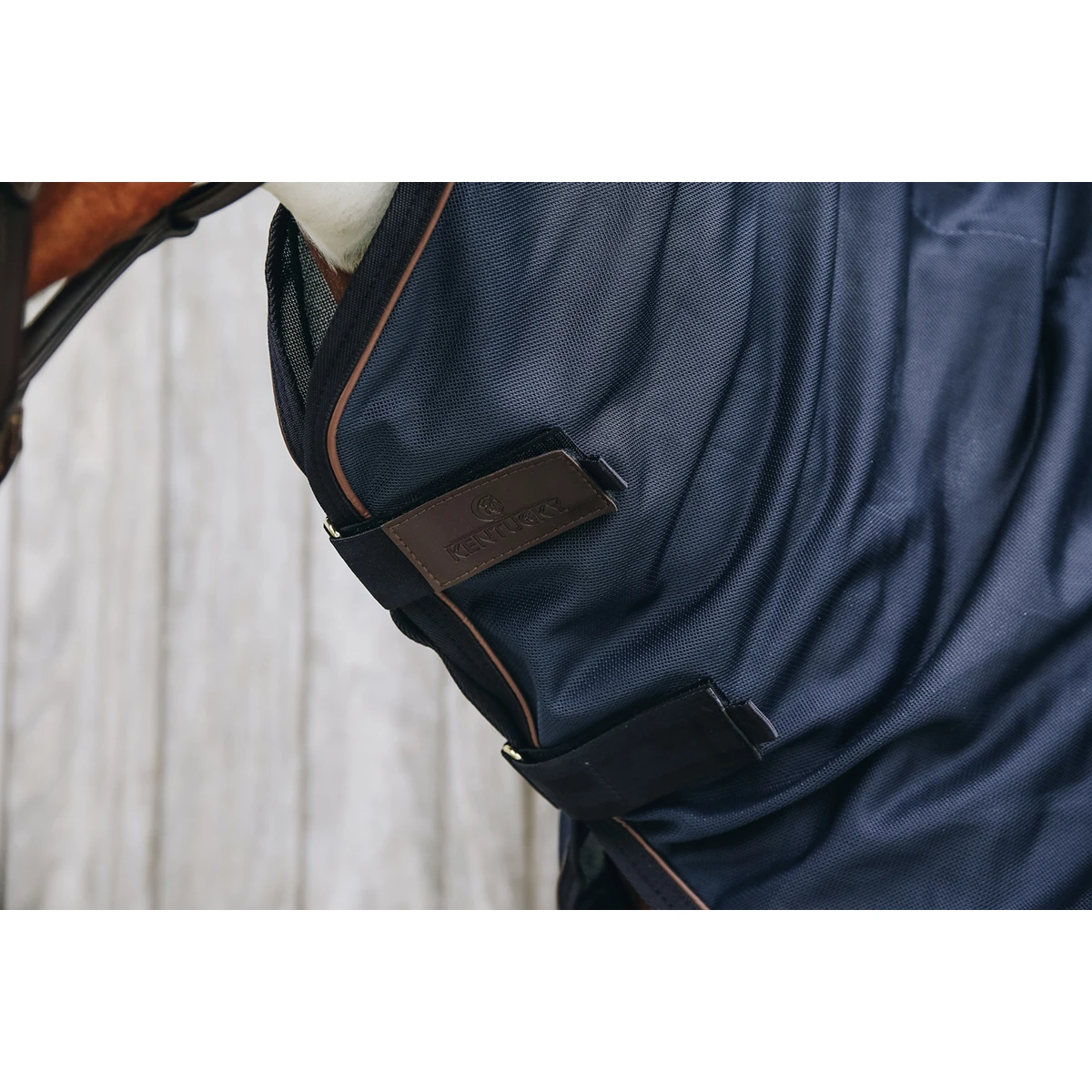 - voorzien van klittenbandsluiting voor bevestiging aan het halster, twee klittenbandsluitingen bij de hals en een clipsluiting ter hoogte van de schoft