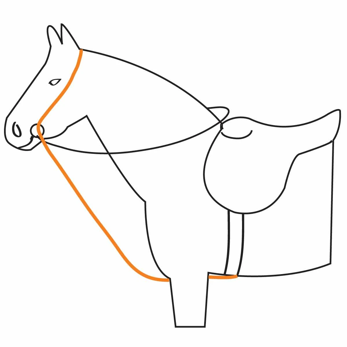- het elastiek loopt van achter de oren door de bitringen heen en kan op verschillende plaatsen worden bevestigd voor verschillende inwerkingen (bijvoorbeeld tussen de voorbenen of aan de bovenste ringetjes van het zadel)