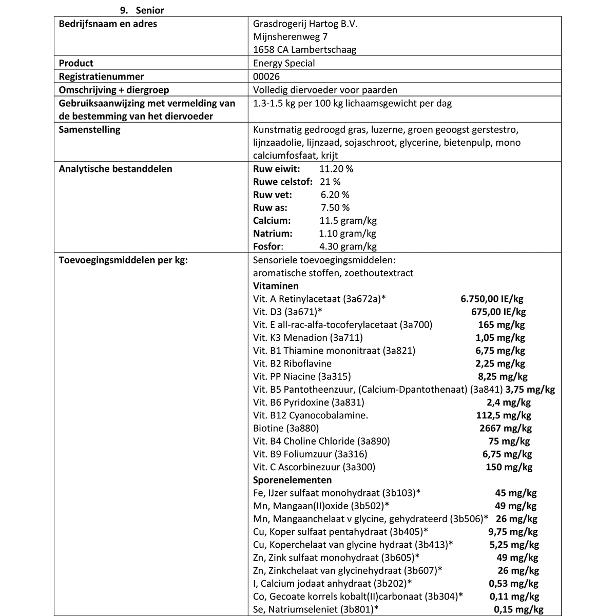 - verrijkt met een premix, deze is speciaal samengesteld naar de behoeftes van het oudere paard