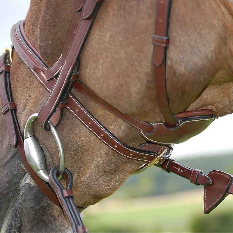 Let op: op dit moment is de innovatieve combinatie van een kaakgekruiste keelriem en een neusriem met sperriem nog niet toegestaan bij de KNHS. Ook een kopstuk dat zover naar achter ligt staat nog niet op de lijst met toegestane hoofdstellen. Kijk op de site van de KNHS voor de meest actuele reglementen.