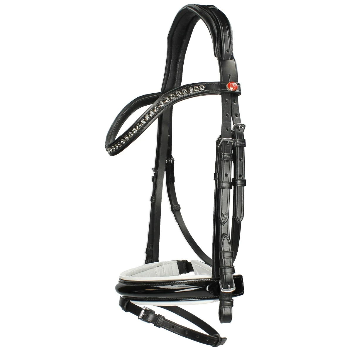 - brede, gecombineerde en zacht onderlegde aansnoerneusriem van lakleer