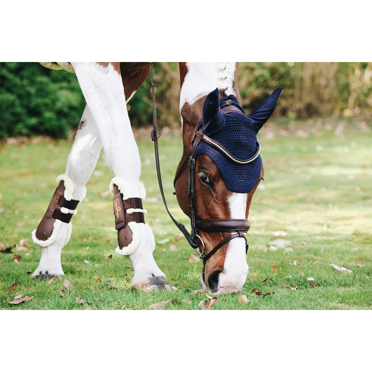 - beschermt de oren van het paard tegen vliegen tijdens het rijden