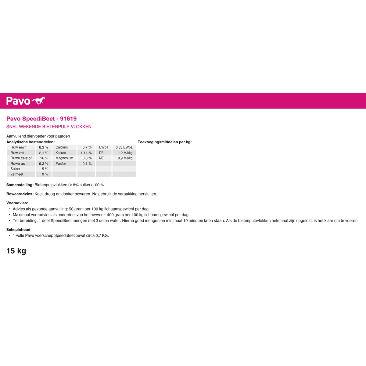 - LET OP! Pavo SpeediBeet kun je alleen in geweekte vorm voeren. Zorg dus dat je het veilig bewaart en dat uitbrekende paarden er niet bij kunnen