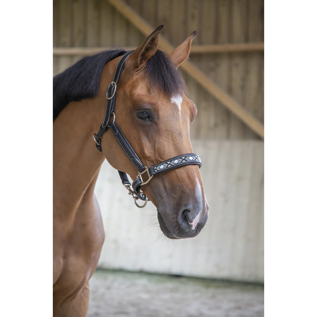 - verstelbaar bij het kopstuk, de kaakriem en de neusriem